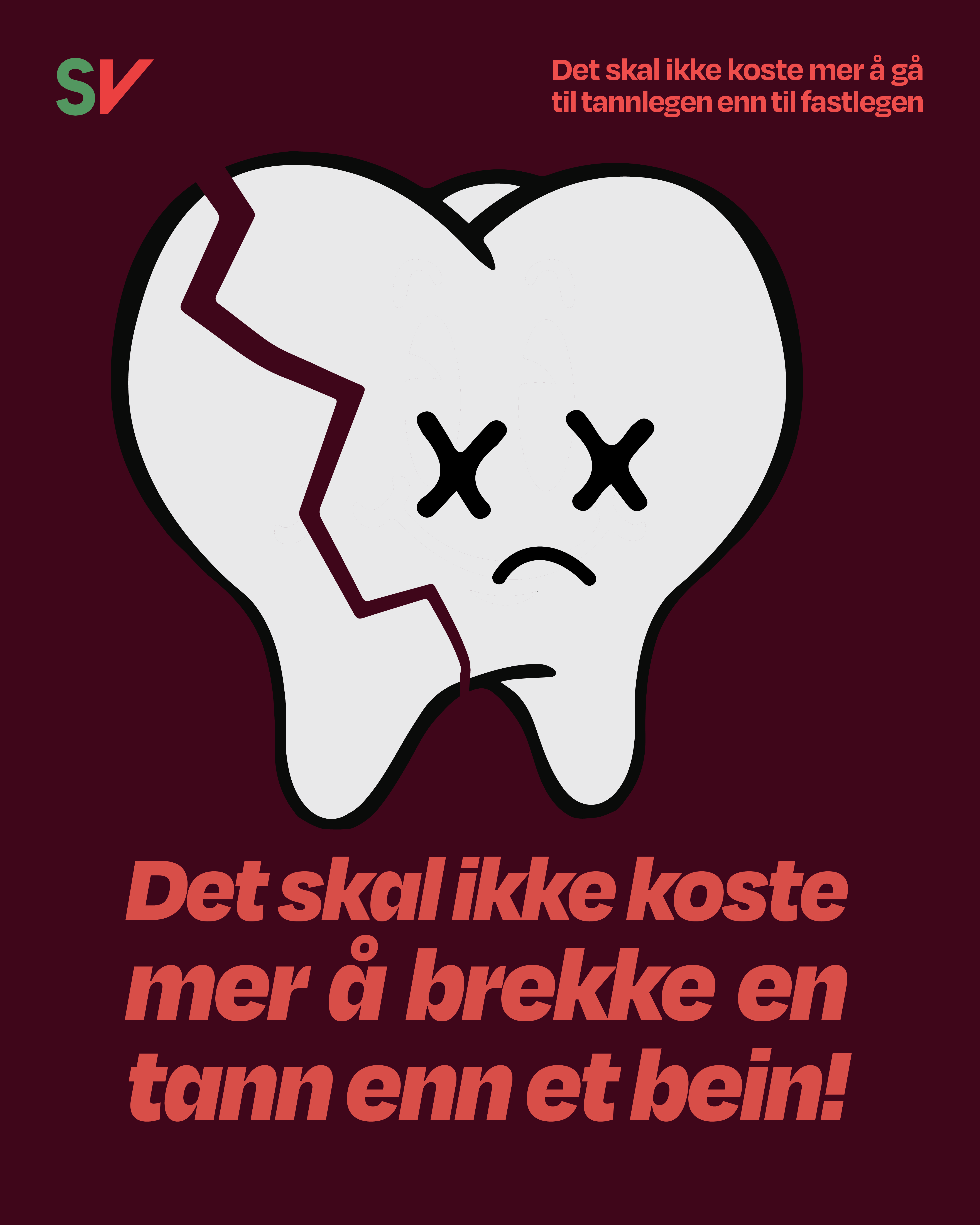 SV har lenge stått i kampen for at tennene skal være en del av kroppen. Vi er stolte av at vi har fått igjennom begynnelsen av en tannhelsereform, der 550.000 unge har fått langt rimeligere tannbehandling. Men vi gir oss ikke før alle har tilgang til rimelige og gode tannhelsetjenester, for vi mener alle skal ha råd til å smile.